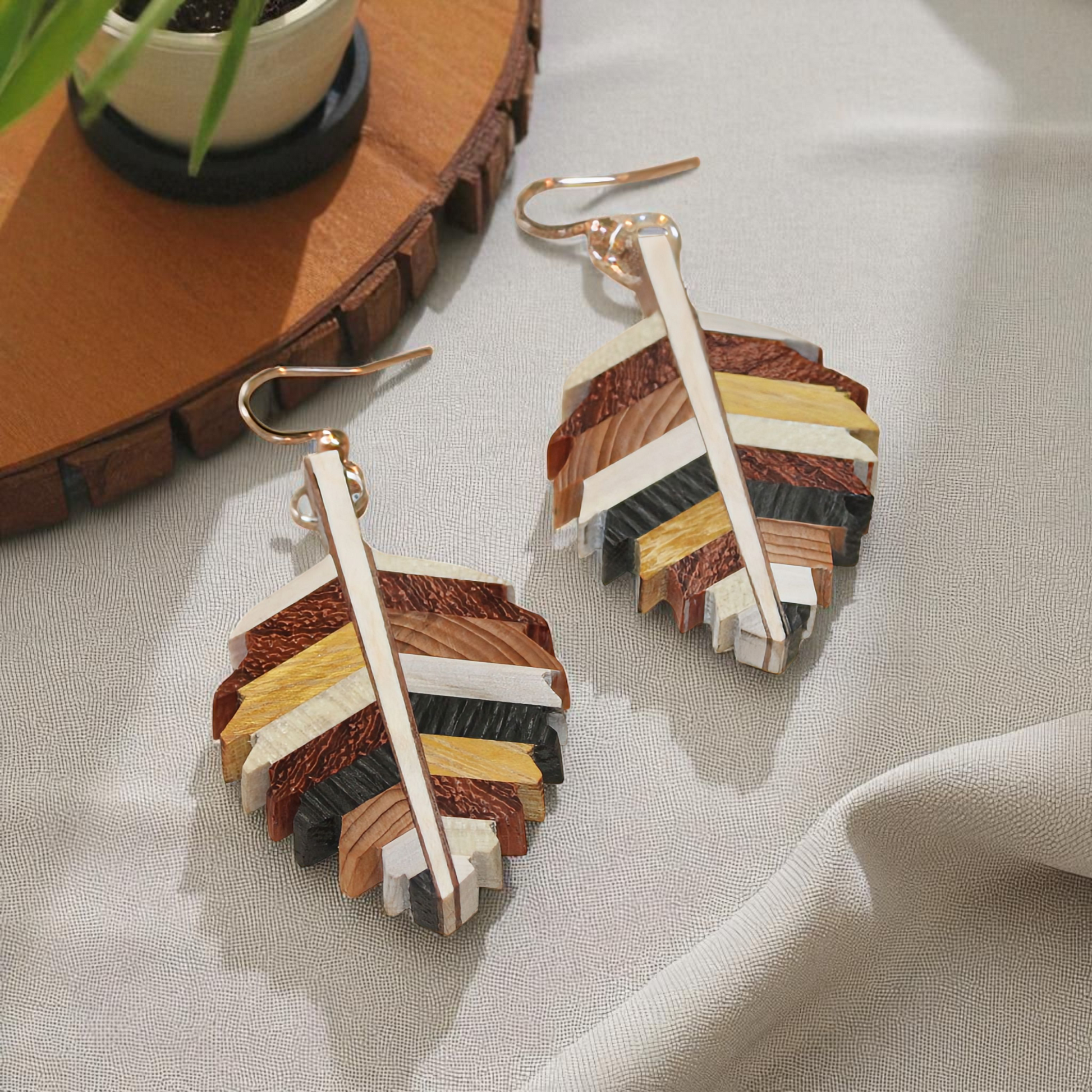 These handcrafted leaf-shaped dangle drop earrings are made using 11 different types of wood including English " bog oak ", English yew, English Holly, Osage and Sheoak. Carefully cut, shaped, sanded, polished and arranged to create a striking layered pattern. No paints, no stains just the natural tones and textures of real wood, left raw and beautiful.